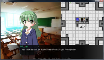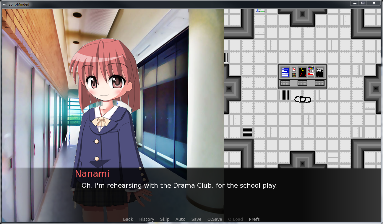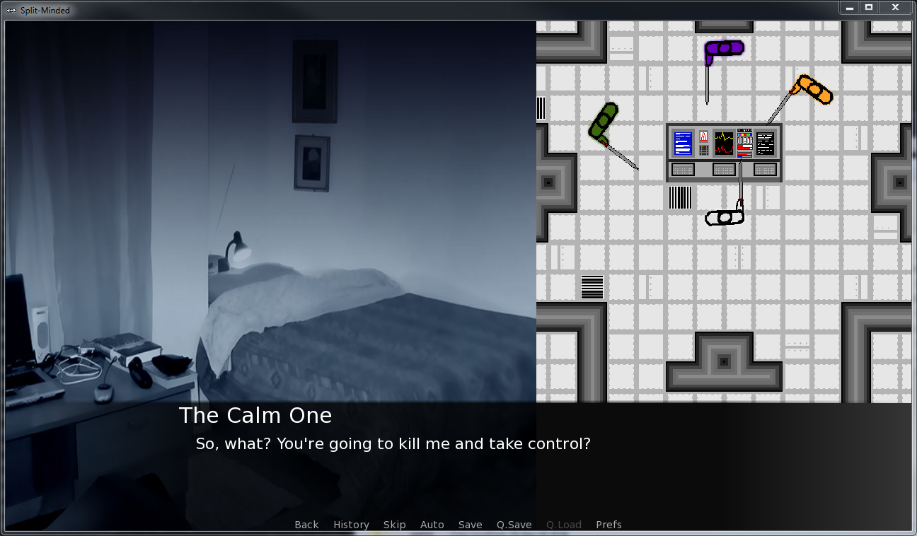 - Click to swing sword in the top-down shooter view or move forward in the visual novel view.
